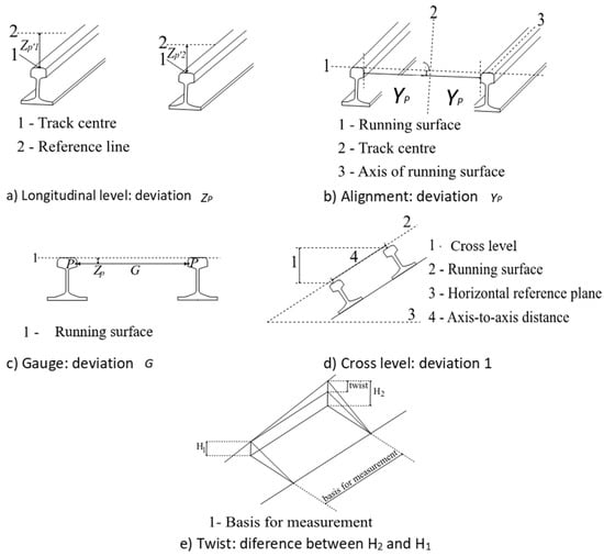 Track geometry is characterized by five geometrical parameters: longitudinal level, alignment, gauge, cross level, and twist. Figure 2a–e show the definitions of the deviations of those five parameters.