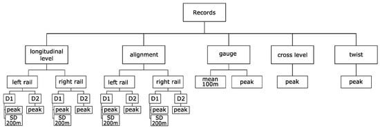 Although the track condition is only fully characterized by five indicators (longitudinal level, alignment, twist, gauge, and cross level), in this study, only the distributed irregularities in terms of longitudinal level and the alignment are considered because these are the two condition indicators whose degradation is more relevant for scheduling maintenance []. As presented in Figure 3, the distributed irregularities in terms of longitudinal level and alignment are characterized by the standard deviation of these two geometrical indicators over 200 m of track length. In this model application, a 51.4 km railway track subjected to 14 inspections actions with different time intervals is under analysis. Thus, a total number of 514 track segments (right and left rails) per inspection are under analysis. The dataset is unbalanced, as the interval between inspections (NDAYS) varies between 69 and 743 days, and the average time is approximately 183 days. For this reason, NDAYS is one of the variables considered in the study.