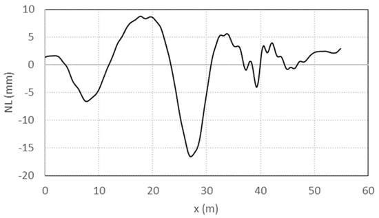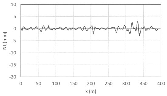 The measured data, which consist of records of longitudinal level, alignment in both rails, gauge, cross level, and twist, are collected by inspection vehicle. The longitudinal level and the alignment records are filtered in two wavelength (λ) ranges: D1 with 3 ≤ λ ≤ 25 m and D2 with 25 ≤ λ ≤ 70 m. With the filtered track profile, some quality indicators should be calculated depending on the type of defect in analysis: distributed or isolated defect (Figure 4 and Figure 5). In these two Figures, NL represents the longitudinal level and x the track position.