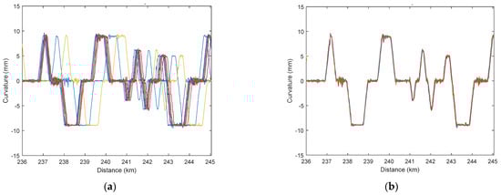 The geometrical track-condition parameters (longitudinal level and alignment) are measured by an inspection vehicle that periodically checks the quality of the railway tracks. In a first phase, these measurements are raw data associated to the track position through GPS. As there is always a small error in GPS coordination of different inspections, when combining raw data from different campaigns a synchronization of the records is needed. As track curvature does not change over time it is used as the base to perform the synchronization of records. In Figure 7a, the curvature profiles of a railway track in several campaigns are shown before synchronization. As it can be seen, there are some offsets between the records that should not exist, since the track curvature is always the same for a given track. Therefore, considering that the track curvature does not change with time, data synchronization can be completed by applying the cross-correlation function to the curvature of each campaign measurement. Figure 7b shows the track curvature after performing synchronization, and now all the records are superposed.