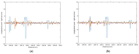 Synchronization of Longitudinal Level—right rail: (a) before and (b) after.