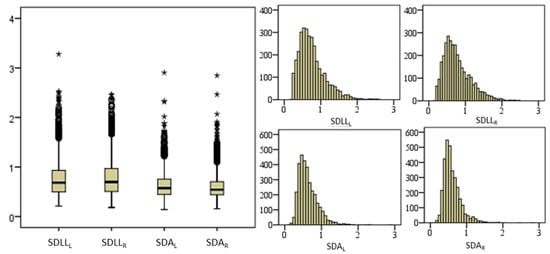 First, a descriptive statistical analysis of the standard deviations of the longitudinal level and the alignment of right and left rails was performed, including the computation of the main statistical measures (Table 1). The distributions of these variables, considered as potential predictors in logistic regression models, are illustrated by boxplots and histograms presented in Figure 9. In general, there are no substantial differences between the left and right rails. The distributions of these variables are moderately homogeneous as the coefficients of variation vary between 39% and 48%. However, the results reveal a positive asymmetry due to the existence of several higher outliers. SDLL takes values between 0.181 and 3.278 with a mean value equal to 0.763 on the left rail and 0.777 on the right rail. SDA takes values between 0.142 and 2.904 with a mean value equal to 0.632 on the left rail and 0.599 on the right rail.