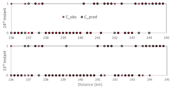 To evaluate the performance, external validation of the model was performed. The logistic regression model was applied to predict the track condition at two inspection times (13th and 14th instant), corresponding to intervals of 203 and 395 (203 + 192) days, and the predicted results were validated with the real measurements. In Figure 10, a comparison between the predicted results (C_pred) and the observed measurements (C_obs) is shown for a track segment of 9 km, which corresponds to 45 track segments of 200 m. From this figure, at the 13th and 14th inspection instants, the track condition is correctly predicted in 37 out of 45 track segments, which is a good result.