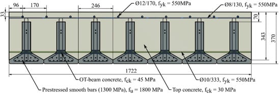 The test specimens used for the experiments were constructed with down-scaled versions of Overturned T-section (OT) beams from an OT-slab bridge, tested in situ in 2017 [16,31]. The beams were down-scaled to 2/3 of the cross-sectional dimensions of the in-situ bridge, thus resulting in a width of 246 mm, a height of 300 mm, while a length of 8400 mm was chosen. The reinforcement ratio was kept the same. Seven beams were used for the OT-slabs, resulting in a total dimension of 8400 × 1722 × 370 mm, including additional top concrete. The cross-section of a specimen is depicted in Figure 2, along with the reinforcement and concrete specifications.
