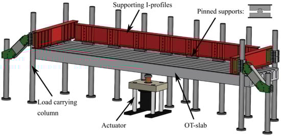 The test setup is depicted in Figure 3. The slabs were tested upside-down to better facilitate the tests and monitoring setup. The load-carrying support system consisted of 14 load-carrying columns with three stiffeners and three supporting I-profiles mounted on the columns with friction clamps. The supporting conditions (supported along three edges and one free edge) were set up as pinned supports (cradle bearings) and ensured a high shear transfer between the beam elements.