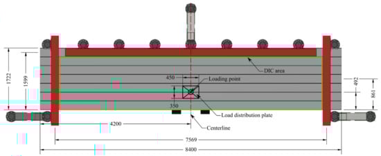 The loading was applied as a point load at mid-span between beam number two and three (from the bottom) by a deformation-controlled hydraulic actuator with a capacity of 2 MN. The load was distributed to approximately 350 × 450 mm using a load distribution plate (see Figure 4). The described test setup gives a transverse span of 1599 mm and a longitudinal span of 7569 mm, also depicted in the figure.