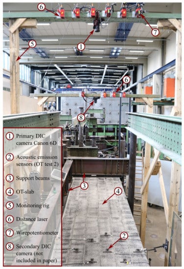 The authors are not aware of any previous studies which have applied the combined methodology in this way on concrete slabs of comparable size. Most studies using DIC and AE involve small-scale experiments [15,49,50,51,52] and apply entirely different methods. The study of Zhang et al. (2020) [39] is more comparable with large-scale tests on concrete bridge girders; however, the focus was more on crack kinematics and localization. The study presented in this paper is thus novel in terms of the practical and optimized use of the methods and its perspective towards field implementation. The use of qualitative observations increases the method’s robustness; hence the influence and significance of environmental conditions may be reduced. The results may contribute to increased use of proof-load testing for structural evaluation of existing bridges in the future.