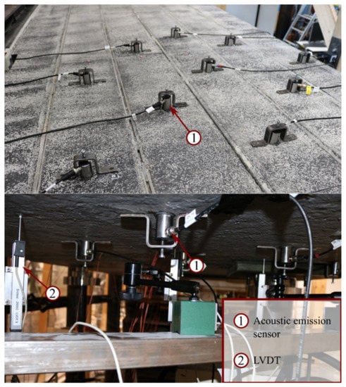 In OT test 2, AE sensors were mounted on both the slab’s top and bottom surfaces (see Figure 6). The sensors were of the type R6I with a central frequency of 60 kHz [55], and MISTRAS software AEwin [56] was used for analysis during the test. Steel holders were used to fix the sensors (see Figure 6), and an electrical compound was used as couplant between the sensors and concrete surface.