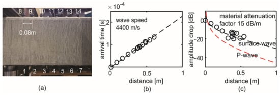 Before load testing, a preliminary measurement on wave propagation properties was performed. Fourteen sensors were installed in two lines, with one line of seven sensors on the top surface and the other of seven sensors on the bottom surface (Figure 8a). The first AE transducer emitted a pulse, which the other sensors received. The arrival time and peak amplitude of the received signals can then be derived. Based on the arrival times at different sensors, the wave speed was estimated to be 4400 m/s (Figure 8b). Figure 8c shows the drop of peak amplitude in dB. The measured peak amplitude here was mainly from surface waves. According to formulae on wave attenuation [57], the attenuation of surface waves and P-waves are estimated as the black and red dashed lines, respectively. P-waves would attenuate around 45 dB after 1 m. Supposing a source amplitude of 100 dB and a noise level of 55 dB, the signal could not be received after 1 m. With this information, the maximum sensor spacing should be within 1 m to ensure that a sufficient number of sensors can receive the signals. The sensor spacing in the OT test (maximum 370 mm) is then within the requirements.