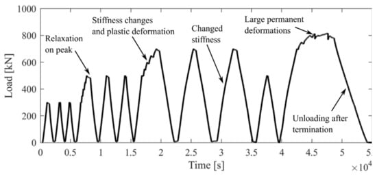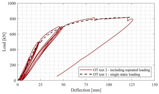 At the 700 kN load level, significant additional permanent deflection is generated with each loading cycle, and this is an indicator of a damaged state of the structure. The maximum deflection increases by 3.9 mm between load cycles one and three, and additionally, the maximum deflection at the following 500 kN load cycle is 10.3 mm larger than in cycle three of the 500 kN load segments. At this point, the structure is irreversibly damaged.