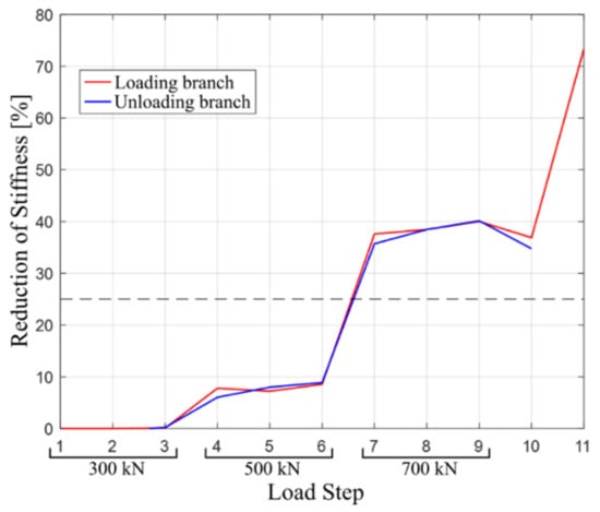 The theoretical method suggested by [21] has been used to evaluate the stiffness change. The method consists on evaluating the reduction of stiffness in the loading and unloading branches. The criterion limits the reduction of stiffness to 25% less than the original stiffness. Figure 12 shows the results from the reduction of stiffness. In the figure, the dashed line indicates the 25% reduction limit. It can be observed that the limit was reached in between load steps 6 and 7 for both branches. This means that during a proof load test, the load would have been stopped at load step 7, which corresponds to 700 kN (see Table 1).
