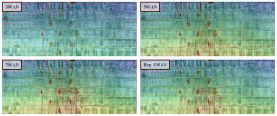 The crack patterns for the third cycle of the three load levels and the repeated loading to 500 kN are shown in Figure 13. The plots provide qualitative information on the damage state of OT-slab 2 at each load level. It is seen how no cracking is visible for 300 kN and how early bending and separation cracks are visible for 500 kN. At 700 kN, yield lines form, and horizontal cracking occurs in the middle of individual beam elements. With the repetition of 500 kN, it is seen that the crack pattern differs significantly from the earlier 500 kN loading and is more similar to the 700 kN crack pattern. This indicates that the loading to 700 kN has significantly damaged the structure. A loading protocol with additional load levels and repetition of load levels could have provided additional information, e.g., between the 500 kN and 700 kN load levels.
