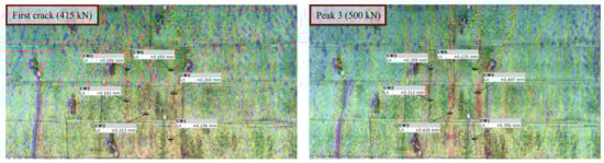 To further assess the damage state through DIC, crack widths have been evaluated. As significant damage seems to occur between the 500 kN and 700 kN load levels, focus is directed towards the three load peaks of the 500 kN load levels and to the time of the first crack detection (415 kN). The repeated loading to 500 kN is included for comparison and damage assessment. These are hypothesized to have a higher relevance for the further proof-loading and stop criteria assessment. The crack widths of six chosen cracks are listed in Table 3, both with and without correction for out-of-plane movement according to [31,33,34,42]. The validity of the crack width corrections was verified through control measurements in areas without any cracks, where any corrected crack width should be approximately equal to zero. The six chosen cracks and measured crack widths are also shown in Figure 14 for the first crack formation at 415 kN and at the third peak of the 500 kN load cycle. It is seen how noise may affect the distinguishing of individual cracks at the early crack detection, whereas the cracks are clearly defined at the third peak at 500 kN.