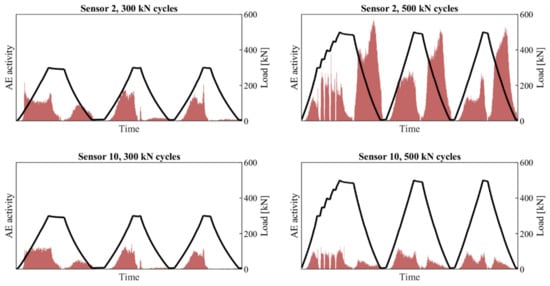 The general term of acoustic emission involves phenomena where transient elastic waves are generated by the release of energy from a localized source [43]. This method thus differs from typical stop criteria identification, but shows promising results for damage assessment. The method has been applied in laboratory conditions for several years [44,45]; however, implementation for in-situ load tests is rarely seen [43,46]. It is possible to estimate the source location of AE hits, classify crack type, and identify damage levels. Typical AE analysis tools [47,48] may provide: