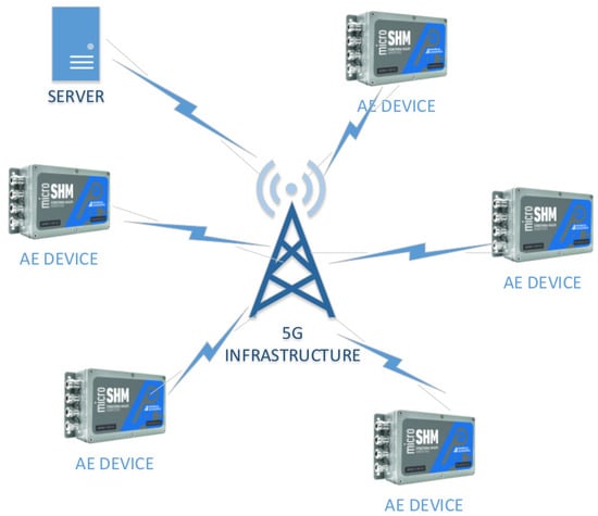 SHM using AE could comprise monitoring the entire state of a structure using an array of sensors and assessing their parameters. Moreover, monitoring of a single location in a structure can be conducted, such as the growth of a crack in a specific part of the structure, using one or a plethora of sensors. The acquisition of data from AE sensors is of utmost importance since the data is continuous and the data need to be transferred to a dedicated server. Wireless communications have emerged in the field of the SHM and AE in order to transmit and forward the data to a terminal computer. In particular, wireless sensor networks (WSN)s [15,16,17] and their successors, namely the Internet of Things (IoT) [18], have been assigned a vital role in the next generation of SHM. Wireless technologies such as zigbee [19], Wi-Fi [20] and telecommunication solutions [21] transform SHM into a wireless networked process, where enhanced autonomicity is accomplished. Note that, especially for the wireless connectivity, solutions such as the Micro-SHM [22] offer 4G capabilities as well as Wi-Fi. In zigbee and Wi-Fi communications, it may experience interference due to lossy links. SHM with acoustic emissions usually requires a Data Acquisition Board to perform calculations of the continuous signal that comes from the AE sensors. Thereafter, the signal that exceeds a specific threshold may be sent to a terminal computer for analysis of specific features. The use of a field-programmable gate array (FPGA) often performs this task. The transmission of the packets using wireless technologies needs to be optimised, in order to meet the high data rate of the AE. Hence, the thresholding of the values. 4G and 5G offer high data rates and low latency; thus, they make a good candidate for SHM.