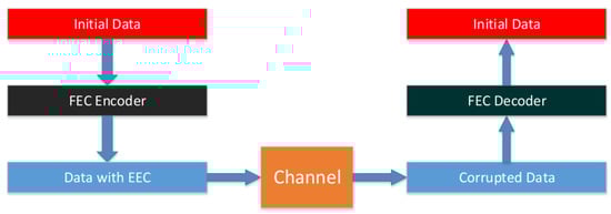 FEC describes a methodology whereby the sender of some data includes an ECC to the initial data, in order to permit the receiver to detect and correct a number of errors that appear in a noisy channel. The procedure is given in Figure 3. This procedure can be applied on occasions when there are multiple receivers. Here, we have a noisy channel whereby messages are difficult to be sent. We experience a drawback of the packet increase with the addition of an ECC; however, the ECC gives the advantage that the receiver will be able to correct certain errors that are caused by noise or interference. This gives the result that systems, which include ECC can suffer some extent of a bit-error-rate (BER) in a given signal-to-noise ratio (SNR).