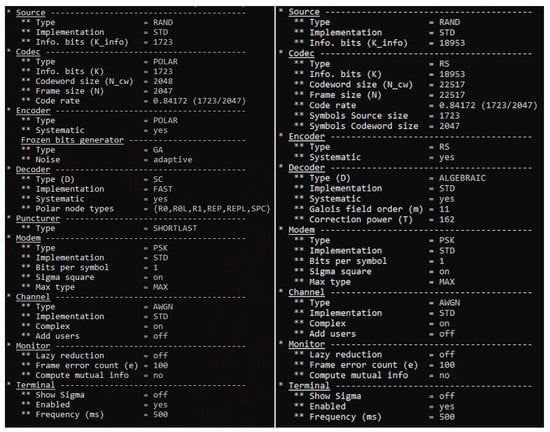 For our simulations, the AFF3CT toolbox [44] is used, which is a toolbox dedicated to FEC or channel coding. It is written in C++ and it supports a large range of codes including the new POLAR codes. Here, we will compare the RS codes with the POLAR codes, in order to show metrics such as the BER, Frame-Error-Rate (FER), and throughput. The AFF3CT comes with a simulator that is used for communication chains and targets channel coding levels. It is based on a Monte Carlo method, whereby the transmitter emits frames with random noise by the channel and the receiver attempts to decode the noised frames. The transmitter keeps on emitting frames until it reaches a number of errors that is fixed. A frame error takes place when the initial frame from the transmitter is different from the decoded frame of the receiver. This results in the number of simulated frames increasing, in conjunction with the simulation time, when the Signal to Noise Ratio (SNR) decreases.