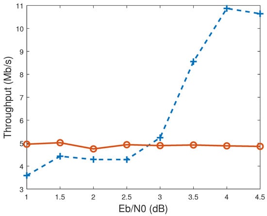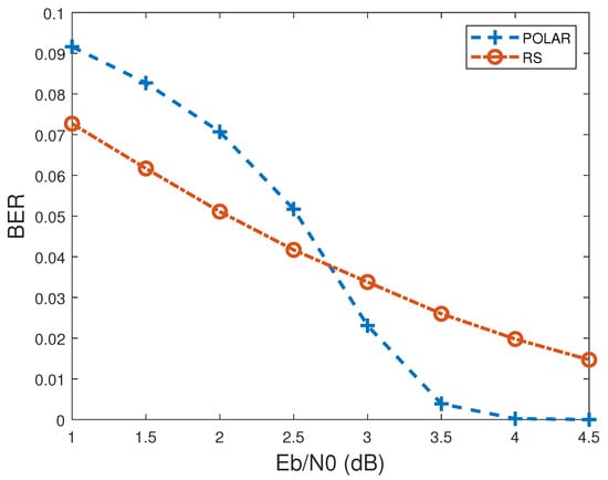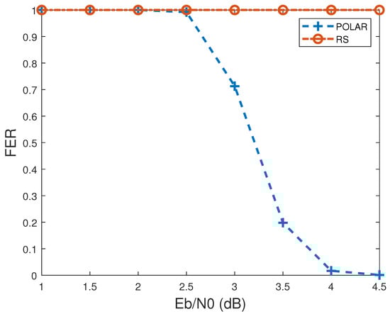 Thereafter, a simulation of the RS vs. the POLAR codes was performed, and the results were determined with respect to the BER, FER, and throughput that have been exhibited. The reader can see the results in Figure 6, Figure 7 and Figure 8. In terms of the BER (Figure 6), we can see a decrease in both RS and POLAR codes as the SNR increases. However, the BER of the RS codes shows a smoother decrease starting close to 0.7 and ending o 0.147. On the other hand, the POLAR codes commence close to 0.9 BER when the SNR is 1.0 dB, and it ends up to 0 when the SNR is 4.5 dB. In terms of the FER Figure 7, the RS codes exhibit a stationary value ot 1.0 FER throughout the simulation experiment. On the contrary, POLAR codes show a rapid decrease from 1.0 FER to 0.0 FER when the SNR is 4.5 dB. Lastly, as for the throughput, the RS codes show a stable value close to 5 MB/s, while the POLAR codes exhibit a rapid increase from below 4 MB/s at the start to over 10 MB/s at the last value of the SNR.