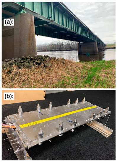 The prototype bridge was selected by picking up one span of a representative composite-deck, steel-girder bridge system, which is the prevalent type in the USA. This representative bridge model is located near Cedar Rapids, Iowa and carries US highway 30 over the Cedar River as shown in Figure 1a. It has a federal ID of FHWA #33472, a span length of 45.7 m, and was investigated in another study as well [43]. This specific bridge has experienced complete inundation by flood incidents during recent years, as indicated by reports at the Iowa DOT.