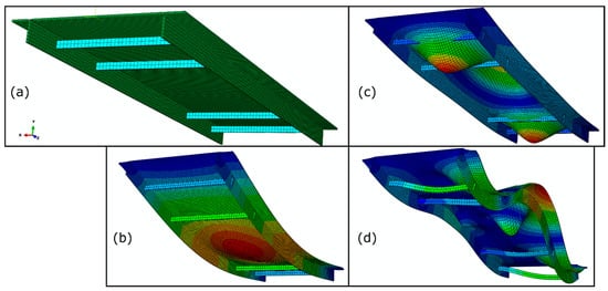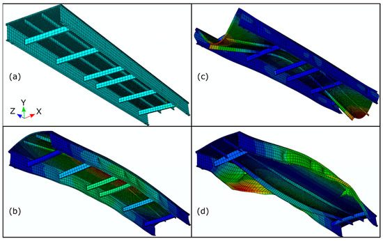FEM of the small-scale bridge and its dominant modes in the dry condition: (a) undeformed FEM; (b) 1st mode shape; (c) 4th mode shape; (d) 17th mode shape. The model is colored by normalized displacement magnitude.