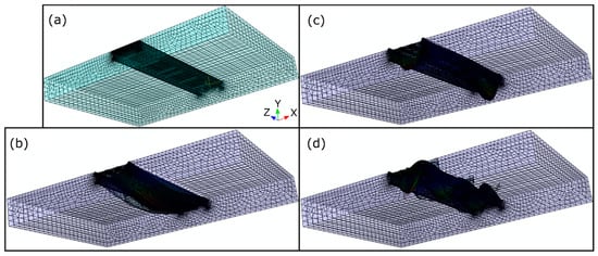 There are several commercial software packages with CAS modeling capabilities that can be used to simulate FSI coupling and extract eigenfrequencies and eigenmodes for a diverse set of FSI scenarios. Applications range from a laminated composite plate vibrating in wet conditions to earthquake-induced sloshing of liquid tanks [16,17]. For containership structures, numerical studies show an up to 30% change in NFs as the composition of the surrounding fluid varies [18]. The effects of varied immersion of composite plates in a dense fluid, along with the effects of material anisotropy on HAM, were explored by Motley et al. [19] and Kramer et al. [20], who demonstrated a reduction of nearly 50% in NFs for steel plates and an 80% reduction for composite plates as those plates were immersed in water. Free vibration of partially submerged surface-piercing struts in multi-phase flow demonstrated both experimentally and numerically that HAM effects could change the ordering of normal modes [21]. Time history analysis of a liquid storage tank to study sloshing effects was performed under several bi-directional earthquakes using CAS and finite element method (FEM) tools [22]. Bend-twist coupled behavior of a composite hydrofoil and the effect of its fiber angle were numerically investigated under dry and wet conditions by CAS simulation [23].