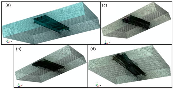 Bridge structures are considered among the most vital infrastructure elements during and after severe weather incidents because their continued operation is necessary to facilitate the transportation of people, goods, and aid between communities. Based on US infrastructure reports, more than 40% of bridges have passed their designed lifespans, and about 10% are already structurally deficient. Among the human and natural contributors to highway bridge collapse under extreme conditions, hydraulic-related damage is a dominant factor in numerous collapse mechanisms [1,2]. It was reported that more than 48% of bridge collapses in the USA between 1989 and 2000 were due to hydraulic-related causes with various collapse mechanisms [3,4,5]. Destructive hurricanes such as Ivan and Katrina led to increased demand for investigation into these failure mechanisms; this requires sophisticated multi-physics modeling to capture the complex loading incidents on bridges during such extreme events. Recent experimental and numerical efforts have explored the forces imposed on bridge deck superstructures by hurricanes and flooding [6,7,8,9], but regulatory guidelines do not reflect the most recent findings. For example, AASHTO’s Guide Specifications for Bridges Vulnerable to Coastal Storms, which regulates instructions for estimating external forces and moments on bridge structures due to potential floods or storms [10], is based on the one-way fluid-structure interaction (FSI) theory. This means that external forces and moments are initially estimated with the assumption that the bridge is a rigid body, and the resulting forces are imposed upon a structural model. This approach neglects the mutual interactions between fluid forces and structural motions, which arise from fluid pressures and shear stresses introduced by structural motions. In particular, the fluid loading exerted in opposition to structural accelerations, termed hydrodynamic added mass (HAM), can cause tremendous changes in structural responses during flooding and storms. HAM is among the FSI considerations absent from the AASHTO code, which leaves inundated bridges vulnerable to excessive vibration amplitudes or unanticipated resonances.