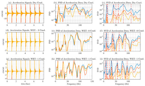 Acceleration data from experimental setup of the small-scale model for NFs extraction by FDD and SVD. The first column (a,d,g) shows the acceleration signals for the dry, semi-inundated, and fully inundated cases, respectively; the second column (b,e,h) shows the acceleration PSD signals for the dry, semi-inundated, and fully inundated cases, respectively; the third column (c,f,i) shows the acceleration SVD signals with detected system poles indicated by vertical dashed lines, passing through the peaks of the SVD signals, for the dry, semi-inundated, and fully inundated cases, respectively.