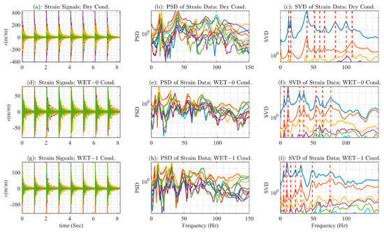 Strain data from experimental setup of the small-scale model for NFs extraction by FDD and SVD. The first column (a,d,g) shows the strain signals for the dry, semi-inundated, and fully inundated cases, respectively; the second column (b,e,h) shows the strain PSD signals for the dry, semi-inundated, and fully inundated cases, respectively; the third column (c,f,i) shows the strain SVD signals with detected system poles indicated by vertical dashed lines, passing through the peaks of the SVD signals, for the dry, semi-inundated, and fully inundated cases, respectively.