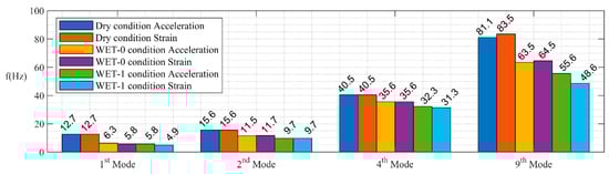 It is immediately clear that the NFs decrease with progressive stages of inundation—a product of the HAM. There is some discrepancy between the accelerometry and strain measurements that grows with increasing modal frequency; this is attributed to the reduced signal-to-noise ratio in the strain measurements at higher frequencies, which is thought to degrade the system identification slightly.