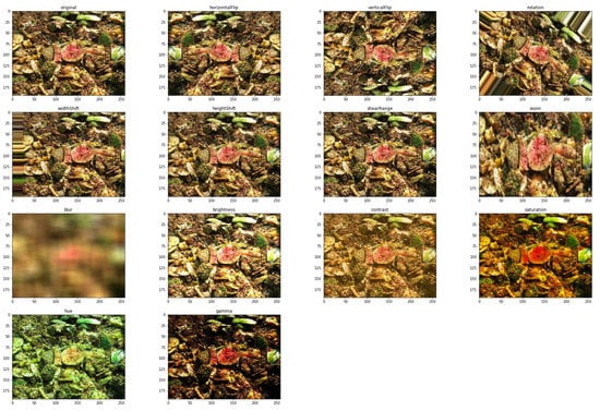 Image augmentation is a useful technique used to increase the diversity of the training dataset such that realistic but random copies of the original image can be generated through simple transformations such as geometric and colour space changes, image cropping, noise injection, and random erasing. By expanding limited datasets, this procedure takes advantage of the capabilities of big data and is known to improve model performance [25]. The augmentation presented in this paper is based on the ImageDataGenerator class provided by the Keras deep learning neural network library [34,58]. Specifically, we used the ImageDataGenerator class to perform 13 transformations on the images (i.e., image rotation and height and width shift); 6 geometric transformations (i.e., horizontal and vertical flip), 5 colour transformations (i.e., contrast, brightness, hue, saturation, and gamma); and 2 additional image manipulations (zoom and blur). The geometric transformations allows for images to be captured in different angles. The colour transformations were deemed necessary to simulate different exposition and luminosity conditions. For the colour transformations, we used only those that do not change the image too much. Default configurations of the ImageDataGenerator class were used for all the transformations, including: image rotation range angle; horizontal and vertical flip allowed; 0.2 width shift range; 0.2 shear range; 0.2 zoom range; 0.2 height shift range (with fill in nearest mode); blur filter enabled; [1.1, 1.5] brightness range; 0.1 hue; 0.5 contrast; 3 saturation; and 2 gamma. These default values can be modified in the image augmentation Python code released with this paper. Some examples of the augmented images are shown in Figure 1, where the top left image represents the original and the rest are augmented images labelled according to the transformation applied.