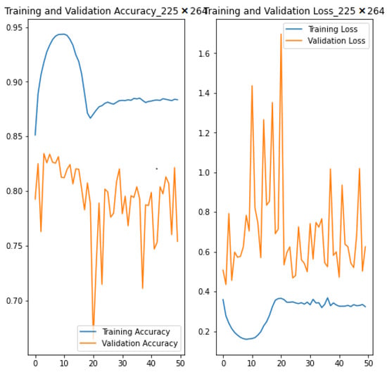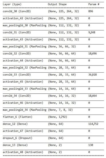 The initial input size shown in Figure 2 refers to the maximum input resolution (i.e., ) for the augmented dataset used to train the larger model. The same architecture, with smaller image resolution (i.e., ), was used for training the smaller model. The number of epochs used to train the network is 50 for all experiments (including the baseline). The training, validation, and testing experiments were performed on the augmented dataset split into 60% training, 15% validation, and 25% testing as shown in Table 2.