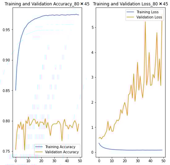 In this section, we present the results obtained from the baseline model as well as the bespoke CNN architecture trained with small () and large () image resolutions. Aggregate measures derived from compiling the models were used for evaluation such as training, validation, and testing and . For simplicity, the performance of the three models are reported together in Table 3. However, the visualisation of the results is represented separately for each model. Figure 3 shows the training/validation and in function of 50 epochs for the smaller model (trained with image resolution), while Figure 4 and Figure 5 show that of the larger model (trained with image resolution) and baseline model, respectively.