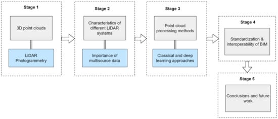 Figure 1 outlines the structure of the review paper. In the first stage, we focus on the importance of 3D point clouds obtained from LiDAR and photogrammetry and outline how LiDAR data is useful in BIM. In the next stage, LiDAR systems based on different platforms are outlined and compared. Additionally, the importance of combining multisource data from different LiDAR and photogrammetry methods is discussed. In stage 3, various point-cloud processing methods are explained and major challenges of traditional and deep-learning approaches are outlined, which can be critical for developing the Scan to BIM framework. Stage 4 defines the interoperability and open standards for Scan to BIM. The last stage concludes and identifies future research directions.