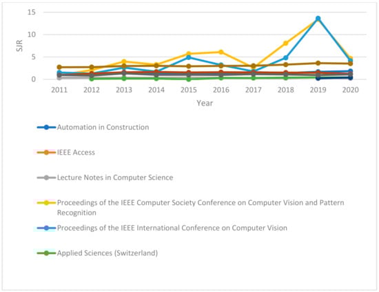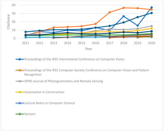 Figure 4, the Proceedings of the IEEE International Conference on Computer Vision gained the highest CiteScore at 37.2, and the second most commonly cited publication was the Proceedings of the IEEE Computer Society Conference on Computer Vision and Pattern Recognition. These journals are mostly related to deep-learning methods of point-cloud processing. It can be seen that the trend of researching deep-learning algorithms is increasing rapidly. However, they have not been applied to large datasets of point clouds in Scan to BIM.