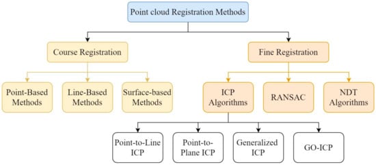38] proposed the integration of point clouds in three levels: low, medium and high. At the low level, point clouds from different sources are processed separately and then merged to obtain final results. At the medium level, features are extracted from one data source, and based on that extracted information, the second dataset is analysed for the final results. At the high level, all the data sources are directly transformed into a single coordinate frame, and then further processing is done of the combined dataset. Although their proposed approach seems plausible, it has not been tested or validated yet. Registration methods are further discussed in detail in