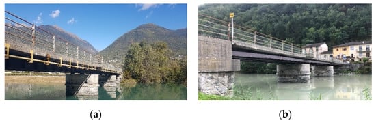 The Baghetto Bridge (Figure 1) is a three-span, steel–concrete composite bridge built in 1966 over the Adda River. It carries the route SP23 between the municipalities of Chiuro and Castello dell’Acqua, about 10 km from the city of Sondrio, in the north part of Lombardy, Italy. The structure—along with other bridges [,]—has been investigated as part of joint research between the Lombardy Region and Politecnico di Milano aimed at defining guidelines for monitoring key infrastructure.