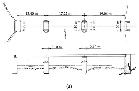 The structure is approximately 50 m long and is composed of three simply supported girders. The steel–concrete composite girders have different lengths, 19.06 m, 17.22 m, and 13.40 m, and have a free span (i.e., the distances between the supports) equal to 18.76 m, 16.62 m, and 13.10 m, respectively. The carriageway is 4.5 m wide, providing an alternating one-lane. The piers and one abutment are in roughly cut stone masonry with concrete strengthening in the upper part, while the other abutment is reinforced concrete. Regarding the geometry, piers and abutments have a height—starting from the foundation level—of about 7 m. The piers have an approximately rectangular section (2.30 m × 5.50 m) with rounded edges. The longitudinal and plan views of the bridge are shown in Figure 2a.