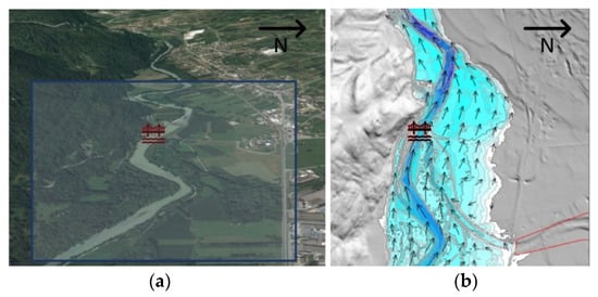 In practice, hydraulic and structural evaluations of existing bridges are performed independently, and the outcomes of each assessment often remain separate. This limit is generally overcome only for scouring. Considerable research has been devoted to understanding scour [] and its effects on structures [,]. There is even a standard procedure for estimating scour at bridge foundations [] or performing structural verification combining usual loads and different extreme events []. On the other hand, the effects of hydrodynamic loads on structures have been studied much less.