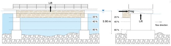 Front and lateral views of partial occlusions (20, 40, and 80%) of one span caused by debris accumulation. Black arrows represent the drag and lift forces acting on the deck.