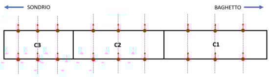 In order to evaluate the dynamic characteristics of the bridge in operational conditions, a first ambient vibration test (AVT) was performed on 20 July 2020. During the test, the vertical and transverse structural dynamic response was measured: three cross-sections for each span were instrumented for a total of eighteen measuring positions, as schematically depicted in Figure 8. As shown in this figure, the sensors were placed on the external curb of the bridge, in order to protect them from cars traffic.