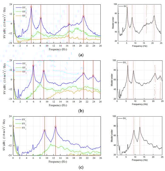 Since analysis of the horizontal signals did not highlight any significant component in the lateral direction, only the vertical dynamic characteristics are herein discussed. Figure 9 shows on the left side the results of data processing in terms of the largest singular value (SV) lines for each span in the range of 0–26 Hz, while on the right side the outcomes of the SSI algorithm are illustrated. Four vibration modes were identified by the local maxima of the first SV line for the longest spans, S1 and S2 (Figure 9a,b), whereas two vibration modes were identified for the shortest span, S3 (Figure 9c).