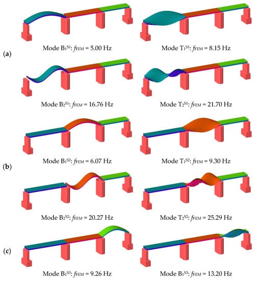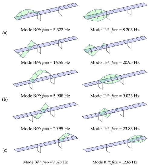 Vibration modes of the updated model: (a) Span S1, (b) Span S2, and (c) Span S3.