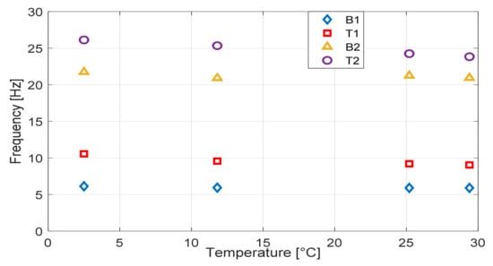The evaluation of temperature effects on natural frequencies is crucial when dealing with repeated dynamic testing or continuous dynamic monitoring (see [,]). As shown in Figure 13, which refers to span S2, changes can be observed for the first two torsional and bending mode frequencies (collected in Table 4). In fact, as temperature increases, the natural frequencies of the central bridge span tend to decrease: changes in frequency up to 15% were observed due to the effects of temperature. The freeze–thaw process [], which is particularly severe for wet concrete bridges when the temperature approaches the freezing point, explains why the highest frequency values were observed at the coldest temperature: close to 0 °C. Water droplets seep into concrete slab pores, and when the temperature gets close to the freezing point, they tend to expand, causing global stiffening of the structure, thus increasing the structure’s natural frequencies. On the other hand, as the temperature increases, the natural frequencies decrease due to softening as a result of temperature changes to the bridge []. The experimental tests presented represent the first step in defining frequency–temperature correlation; in subsequent years, the relationship between modal parameters and environmental parameters will be detailed through exploitation of new data.