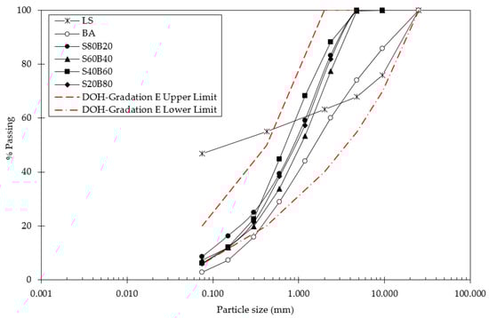 Grain size distribution curves of the LS, BA, and LS+BA.
