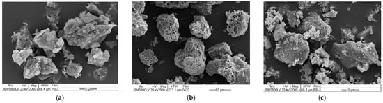 The Hydraulic Cement (HC) used in this study was from INSEE Petch Plus, which is a general use (GU) type according to the Thailand Industrial Standard (TIS 2594-2013) []. The chemical composition (Table 2) revealed the presence of calcium oxide (CaO), which was approximately 65%, and acted as the dominant mineral in the HC. The SEM image (Figure 2c) depicts irregular shapes with sharp corners.
