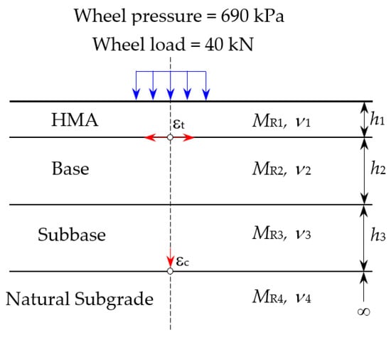 The mechanistic–empirical (M–E) design method is based on material mechanics and relates to an input, such as wheel load, and an output or pavement response, such as stress or strain. Laboratory tests and field performance data are used to predict distress using these response values. As theory alone does not prove sufficient for designing realistic pavements, reliance on the observed performance was required []. In this study, stress-strain analysis was performed using the KENLAYER computer program, which is based on the multi-layer elastic theory. The design procedure and input parameters for this analysis are illustrated as follows.