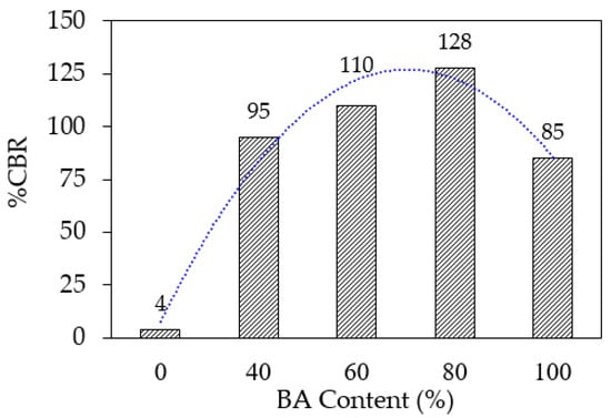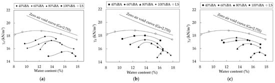 Figure 4 shows the typical compaction curves of the CSS specimens at a different BA and cement content. The compaction curves the γdmax and OMC for pure lateritic soil (LS) were 18.8 kN/m3 and 14.4%, respectively. Overall, all compaction curves of CSS specimens were lower than that of LS. As observed in Figure 4a–c, CSS specimens depicted a reduction in the γdmax values with the increase in the BA content. For example in Figure 4b, the γdmax decreased from 18.8 kN/m3 to 18.0, 17.42, 17.0, and 15.48 kN/m3 after replacement by BA of 40, 60, 80, and 100%, respectively. This decrease in the γdmax is related to the increase in the OMC of the mixtures, which describes that the LS treated with BA and cement specimens require a higher water content to reach the γdmax, compared to pure LS. The increase in the OMC was attributed to the replacement of coarse grains by the BA, which had a higher adsorption capacity than the LS []. The reduction in the γdmax was due to the fact that the BA had a specific gravity lower than that of the LS.