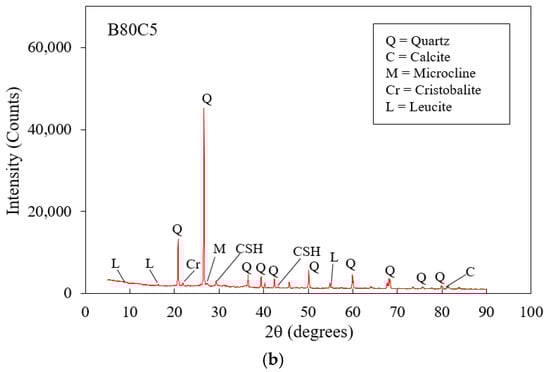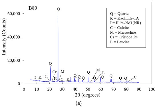 Figure 5 shows the CBR values of uncemented specimens after 4 days of soaking. The CBR value of the untreated LS was 4%, and this increased to 95, 110, 118, or 85% after blending with the BA at 40, 60, 80, or 100%, respectively. The XRD patterns of the uncemented (80% BA replacement) specimens are depicted in Figure 6a. As seen in Figure 6a, the main component of the specimen was quartz (SiO2) in a crystalline form. Kaolinite is a clay mineral, and quartz and calcite are non-clay minerals []. Therefore, an increase in the CBR value can be explained by the presence of calcium carbonate (CaO) in the BA, which affected the chemical reactions between the CaO and CO2 in the calcite form, including the pozzolanic reaction, which contributed to the high CBR value, which was confirmed by the XRD graphs in Figure 6a.