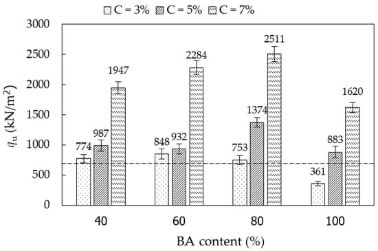 The qu of CSS specimens for different BA and cement contents at 7 days of curing time.