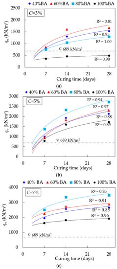 The mean values of the qu and E50 obtained from the UC test for the CSS specimens are summarized in Table 4. The letters B and C refer to the dosages of the biomass bottom ash and cement, respectively. For example, B40C3 denotes the mixture with the replacement of LS by 40% BA, and is stabilized with 3% HC. Figure 7 depicts the variation in qu values and BA replacement contents for CSS specimens after 7 days of curing time. The minimum qu value for the soil–cement subbase at 7 days, as specified by the DOH of Thailand [], is 689 kPa, as shown by the dashed line. Figure 7 shows that, with the exception of the specimen containing 100% BA and 3% cement, the majority of the specimens met the DOH specifications’ minimum values. The strength of all specimens with varying cement content followed a similar pattern, with an increasing trend with increasing cement content. When 40 and 60% BA content were added to specimens stabilized with 3% cement and 7% cement, the qu tended to increase. Beyond 60% BA addition, a downward trend in the qu was observed. While the specimens were stabilized at 5% cement, the qu increased as the BA content increased from 40 to 80%. The qu decreased as the BA content exceeded 80%. Figure 8 shows the relationship between the qu of the CSS specimens corresponding to curing times of 7, 14, and 28 days, with the only notable difference being in the cement content. As observed, the qu values of all CSS specimens increased progressively and logarithmically with the curing time. This trend was consistent with the previous investigation [,,].